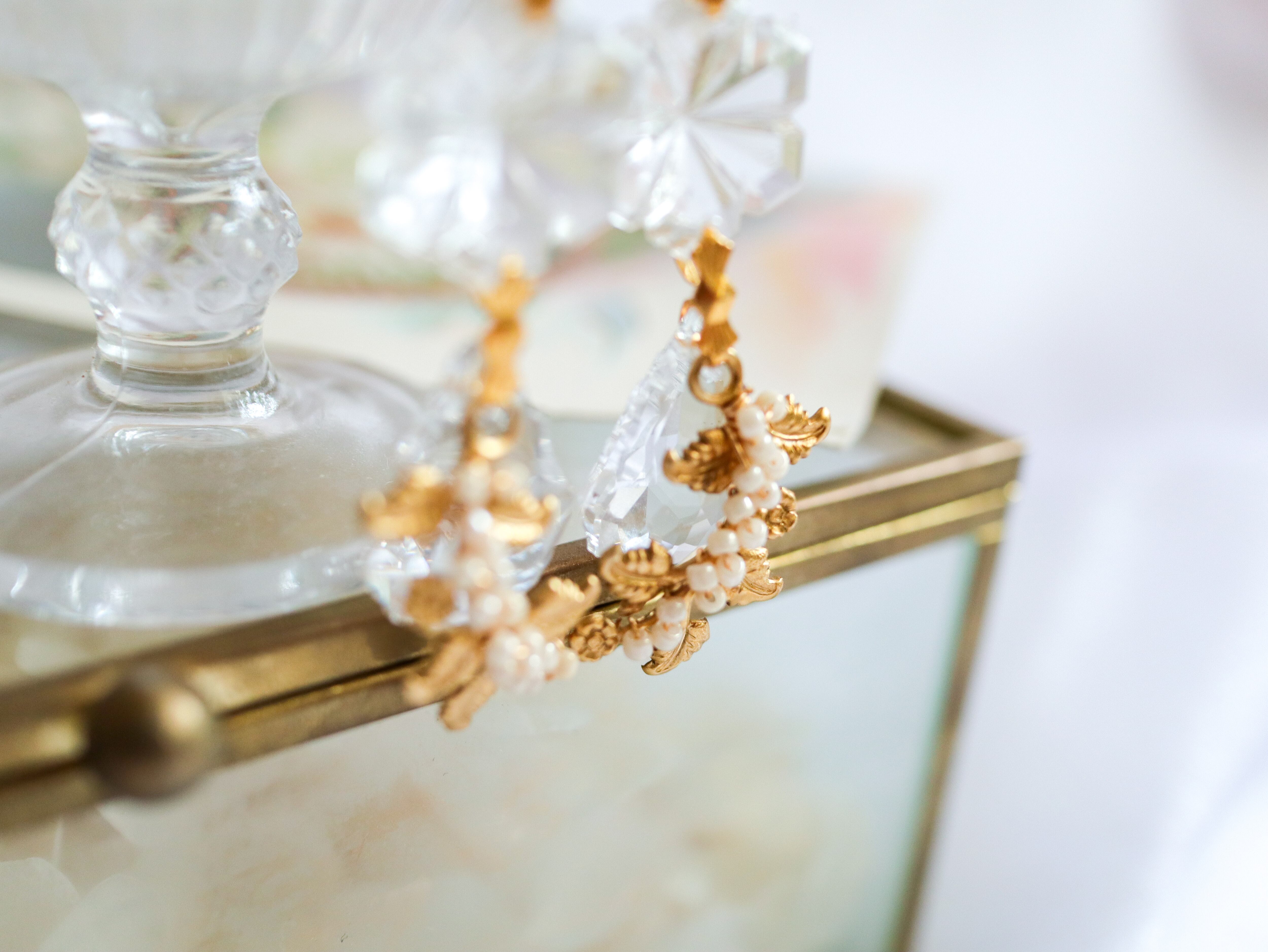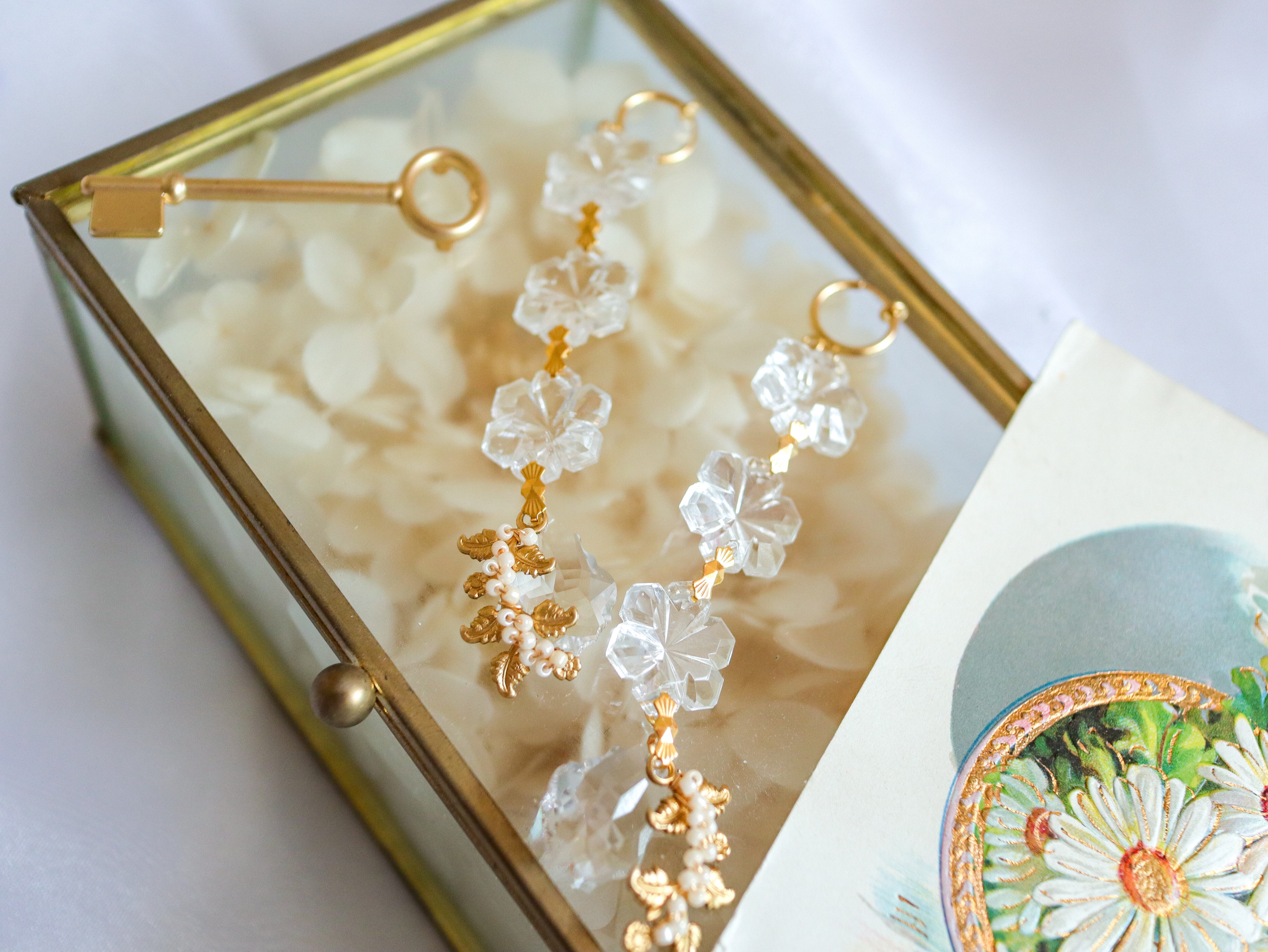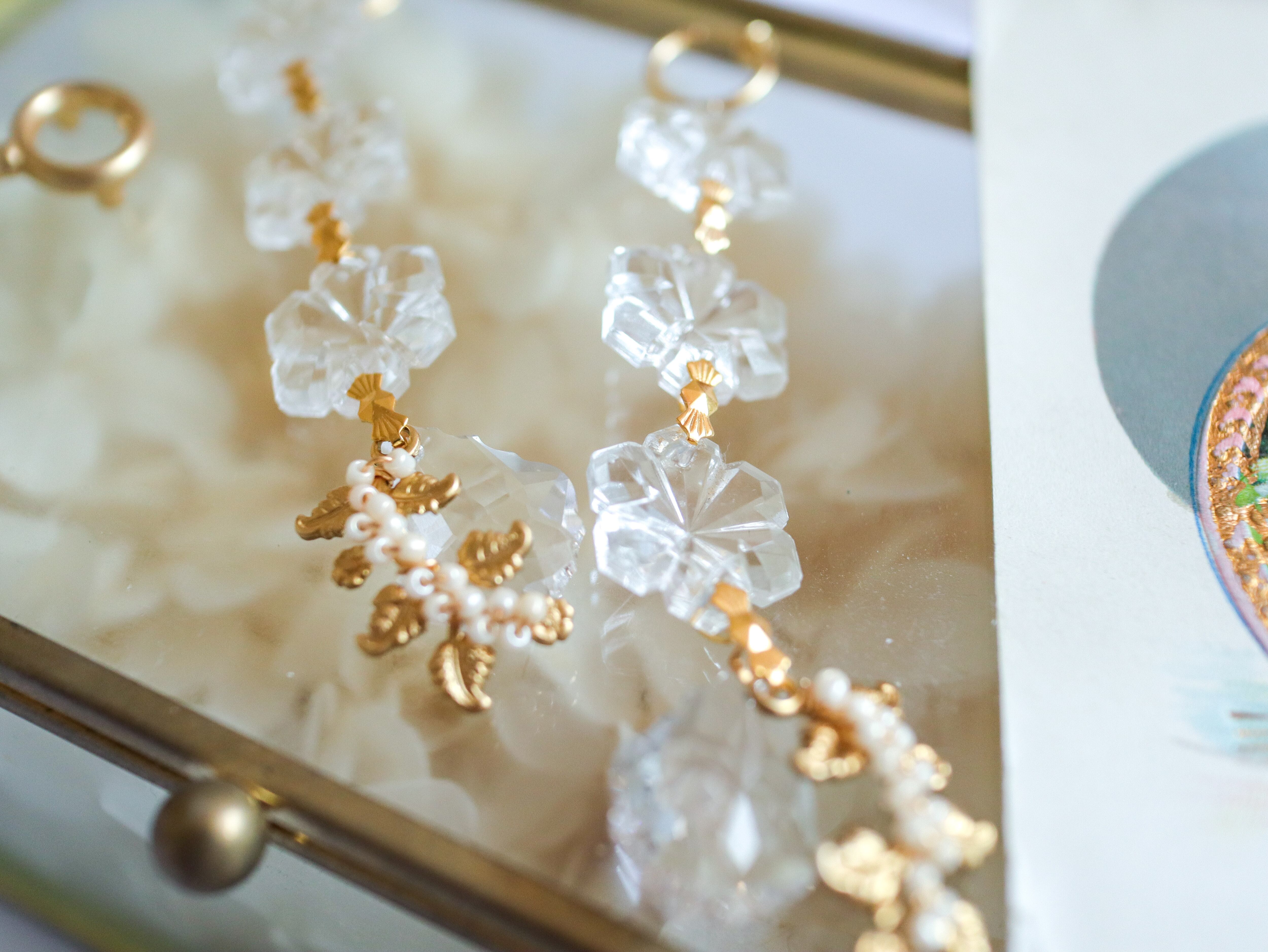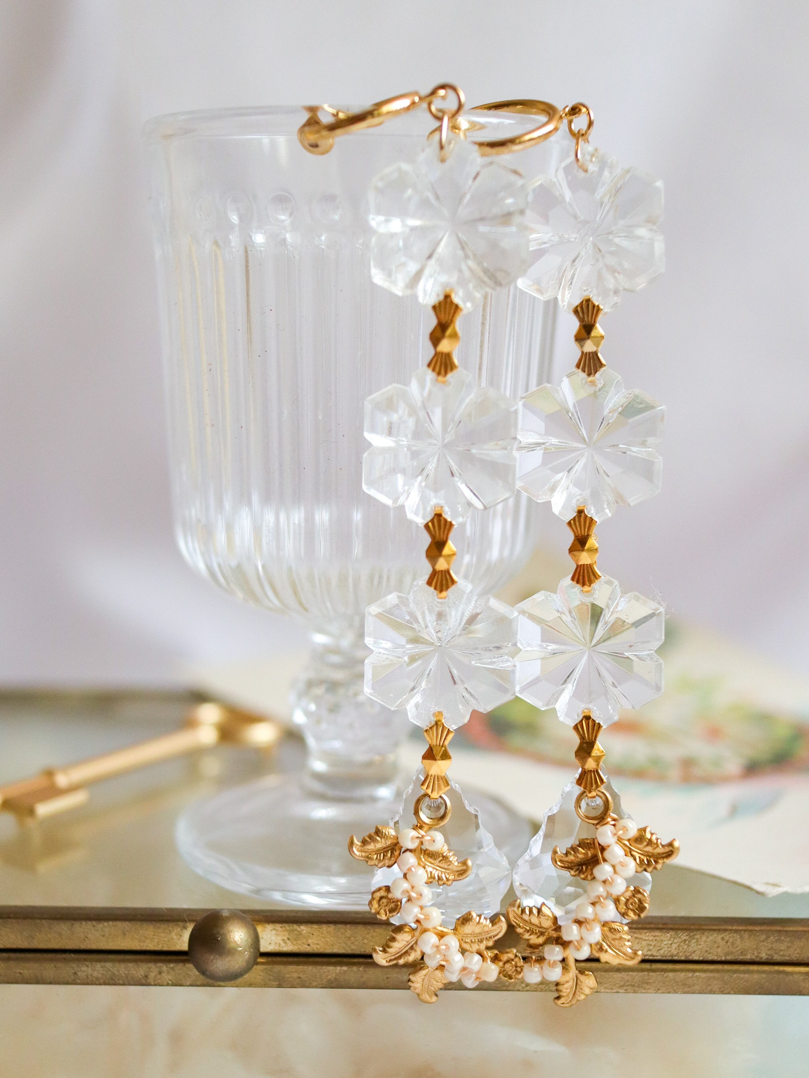 クリスタルガラス、真鍮のフラワーパーツ、ヴィンテージのシャンデリアクリスタルをあわせた耳飾り。