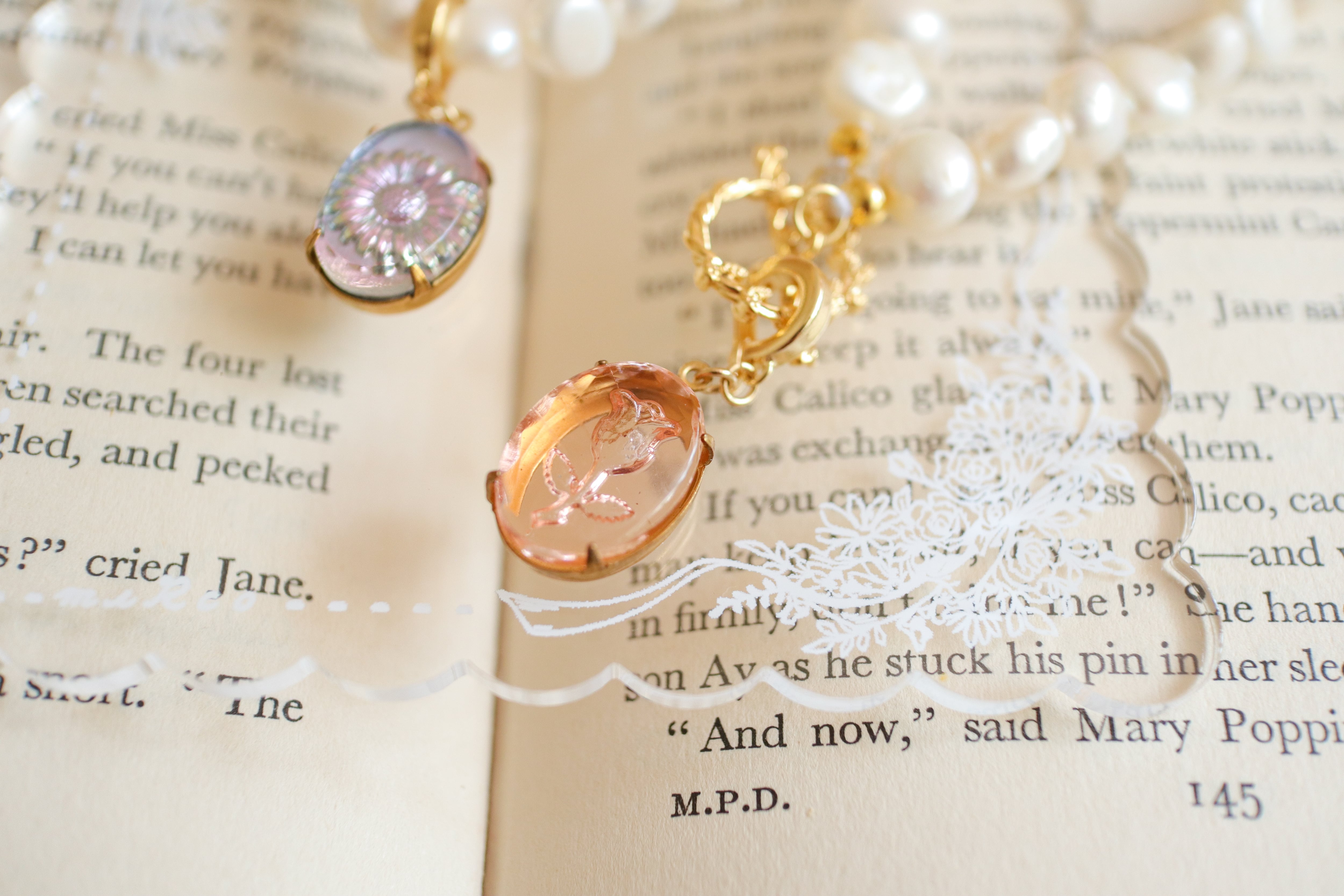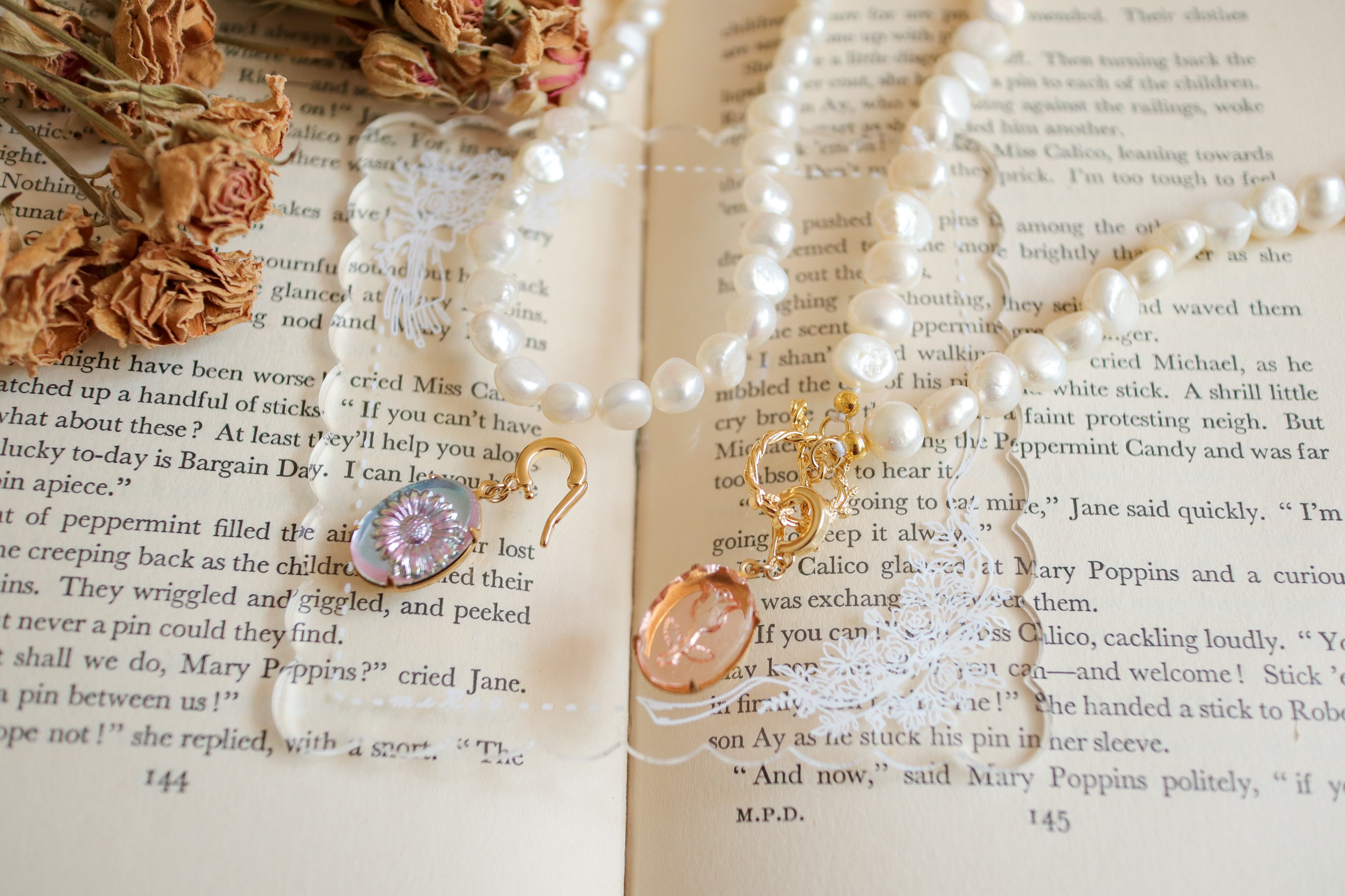淡水パールのチョーカーネックレスとロザリン/ヴィトレイルライトのお花が描かれたインタリオ