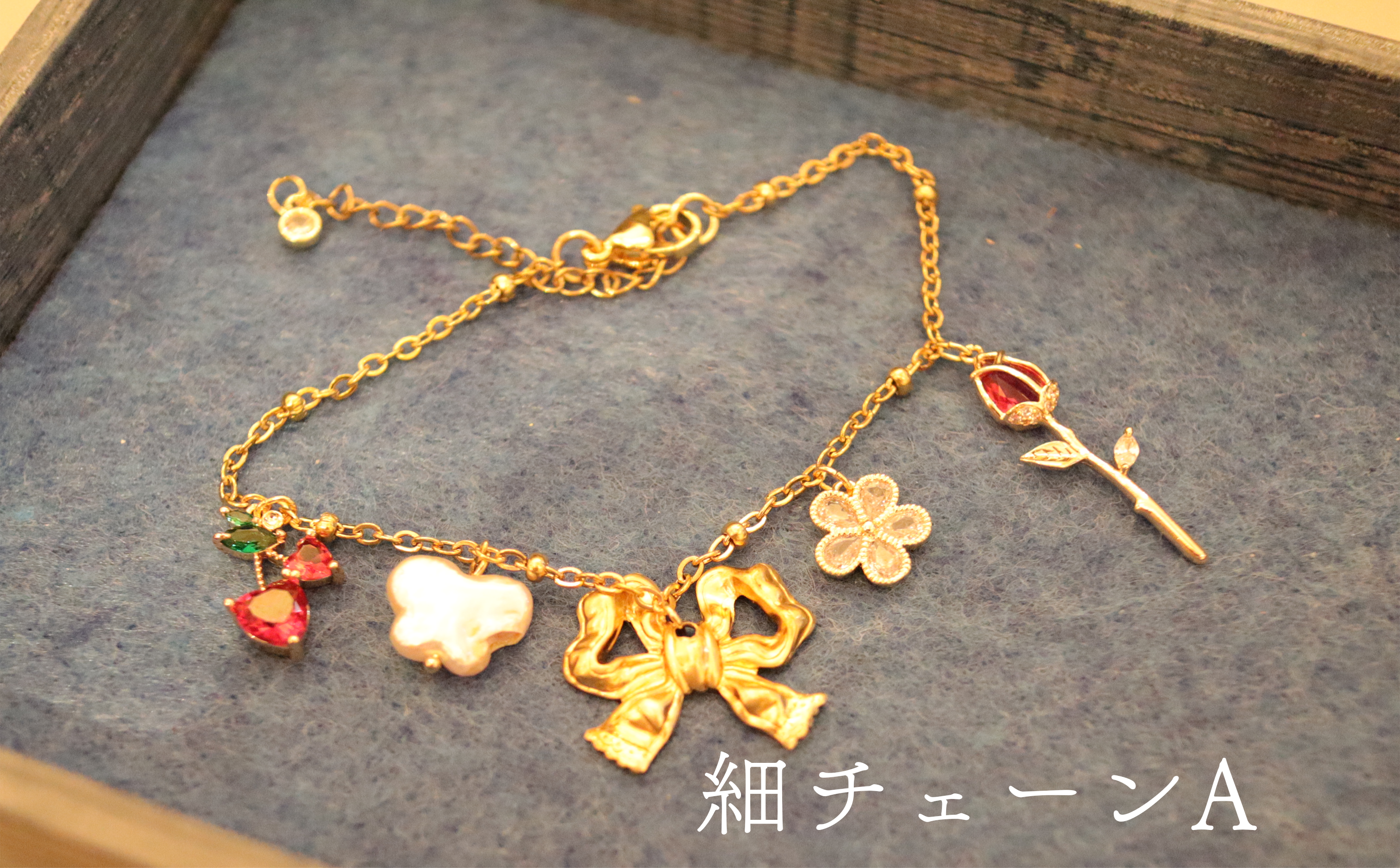 金具はご指定がなければカニカン+アジャスターです。アジャスターの先にチャームをつけたい場合はオプションをご選択の上、付けたいチャームのモチーフをメッセージよりご指定ください。