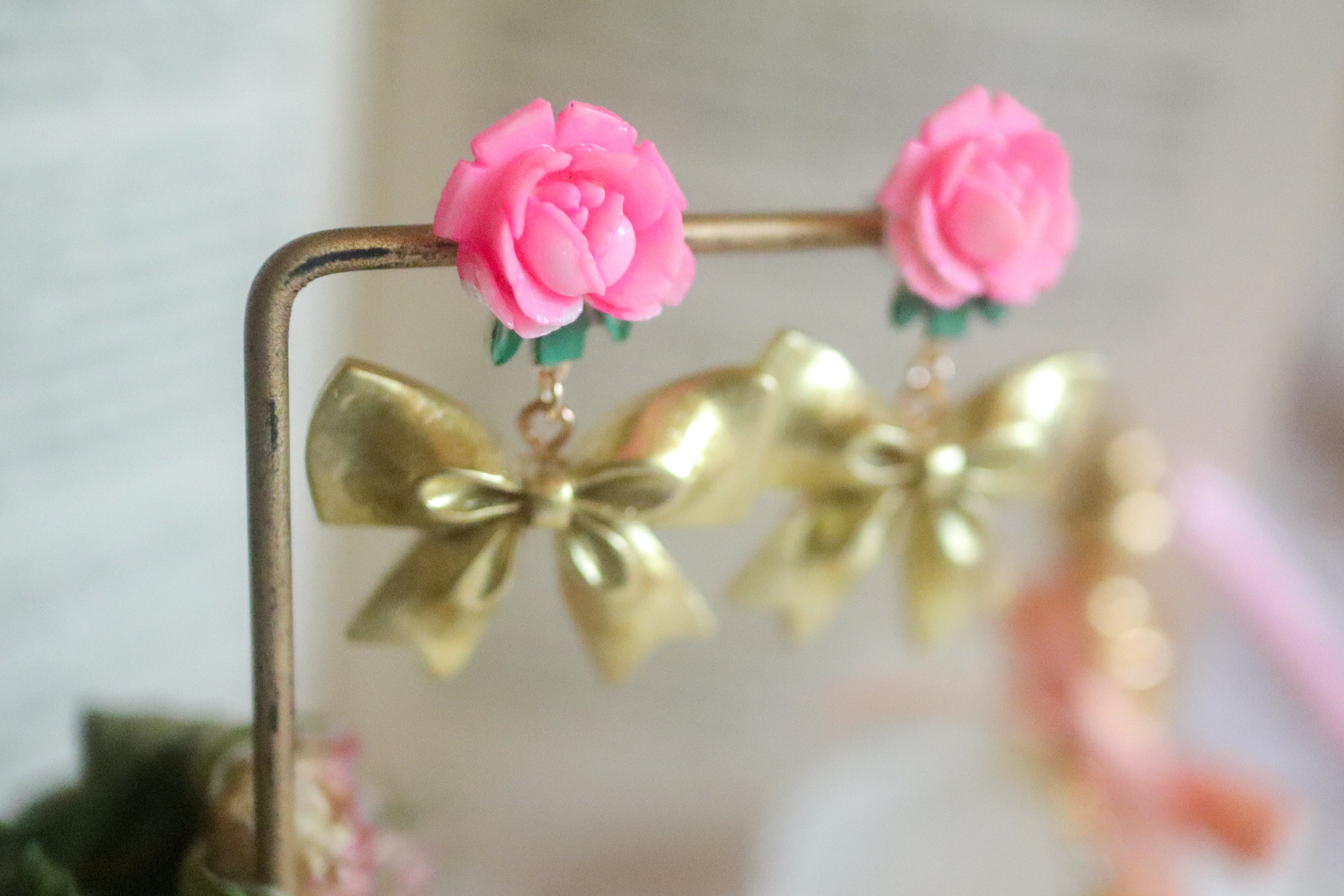 ヴィンテージセルロイドのバラカボション、ゴールドのリボンチャームを合わせた耳飾り。