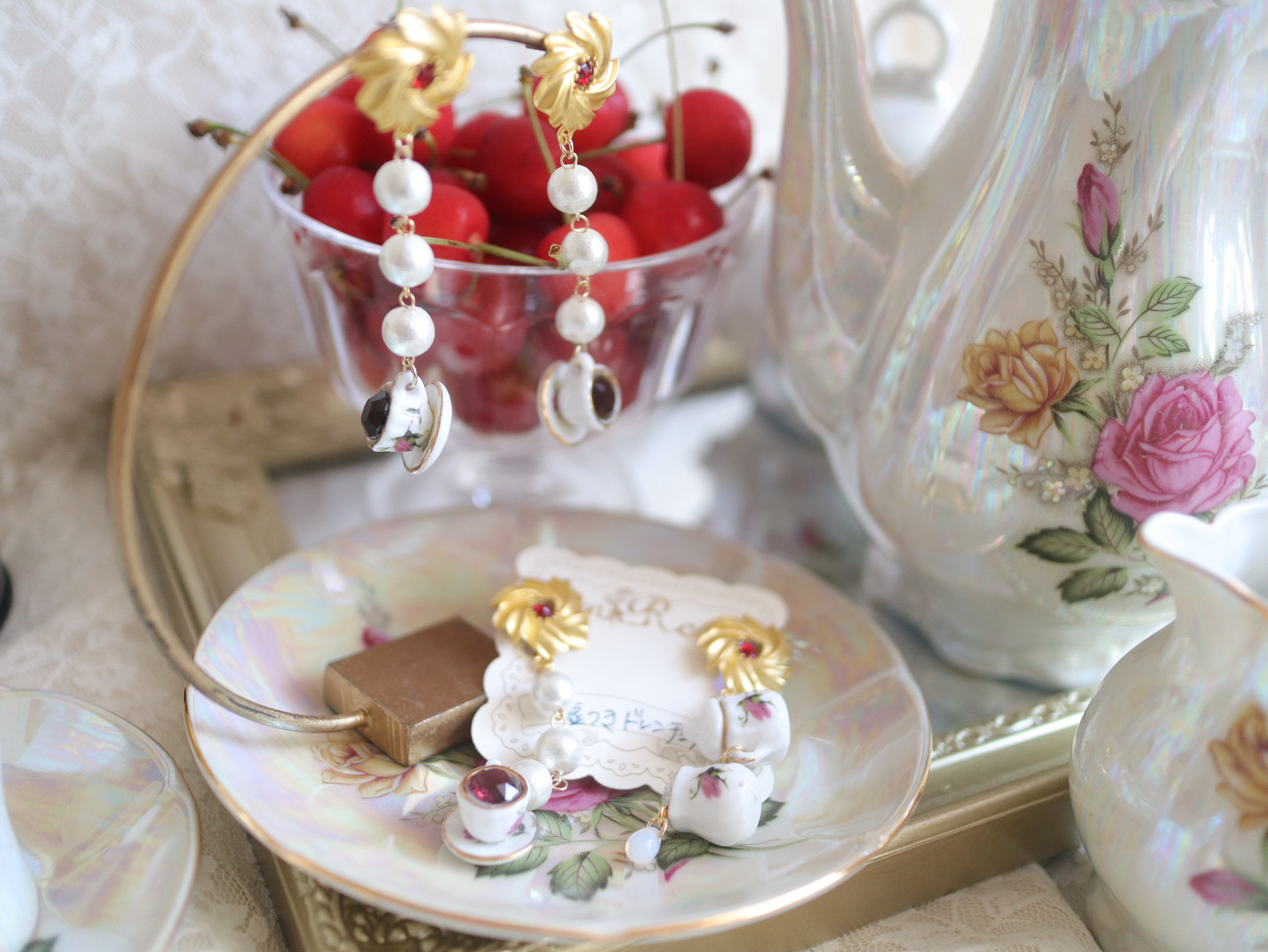 陶器でできたミニチュアのティーカップとシュガー&ミルクポットを合わせた耳飾り。