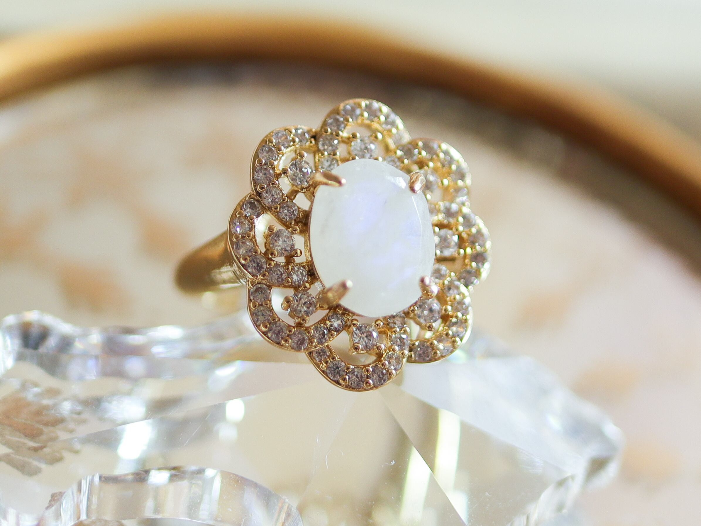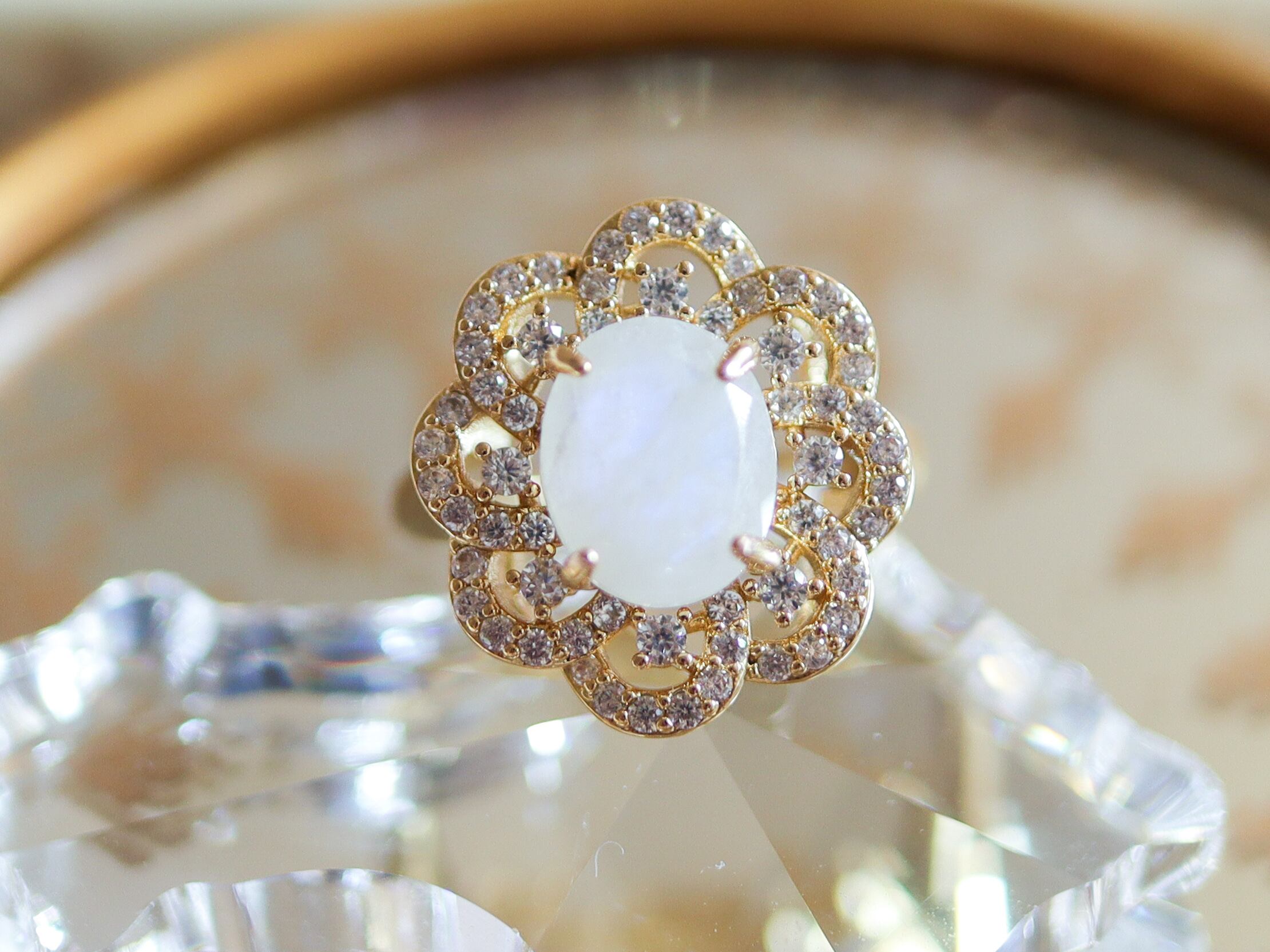 宝石質のレインボームーンストーンをジルコニアのリング台に合わせました。