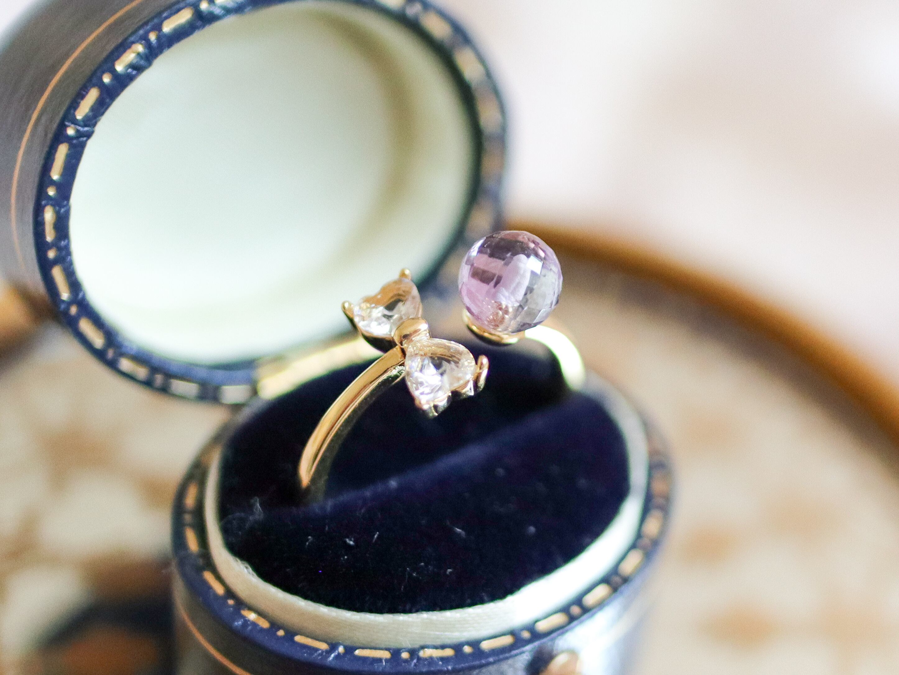 透明感のあるベースにカットの輝きが引き立つアメジストと、リボン型のジルコニアの煌めきが美しいリングです。
